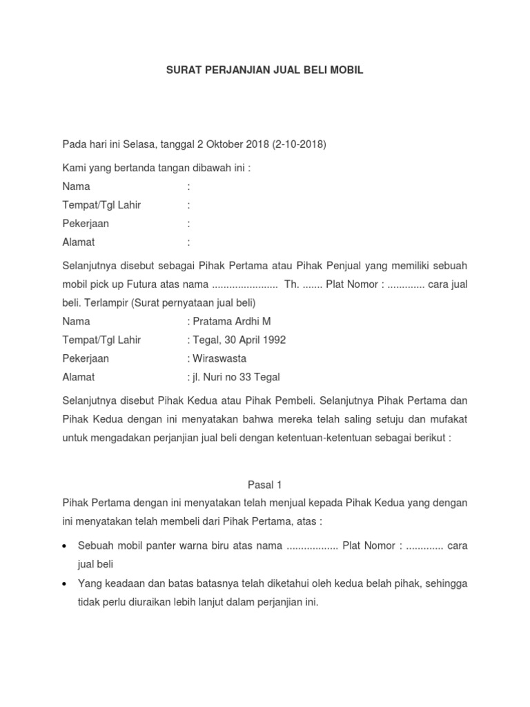 Jika anda membeli kendaraan bekas dari penjual pribadi, penjual dapat meminta anda untuk menandatangani tagihan penjualan, yang merupakan bentuk persetujuan pembelian mobil yang sangat disederhanakan. Sama halnya dengan motor, mobil. Berikut ini adalah contoh surat kuasa untuk menjual mobil milik pemberi kuasa. Berikut di bawah ini adalah contohnya yang bisa anda jadikan rujukan. Apa itu perjanjian pembelian mobil?